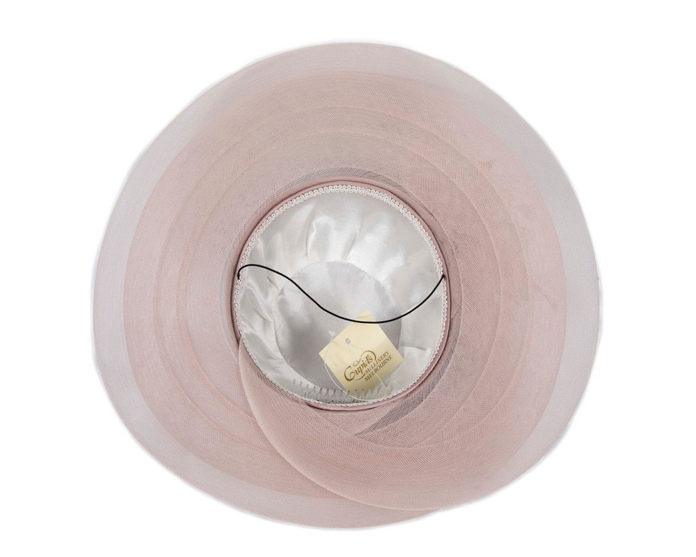 This stunning hat from our beautiful range of mother of the bride, evening, church and special occasion hats is hand made from combination of dull and shiny sides of luxurious fabric with synthetic horse hair (crinoline), fully lined and has comb for comfortable wearing. This designer fashion hat is made to order and we can make it in many colours.