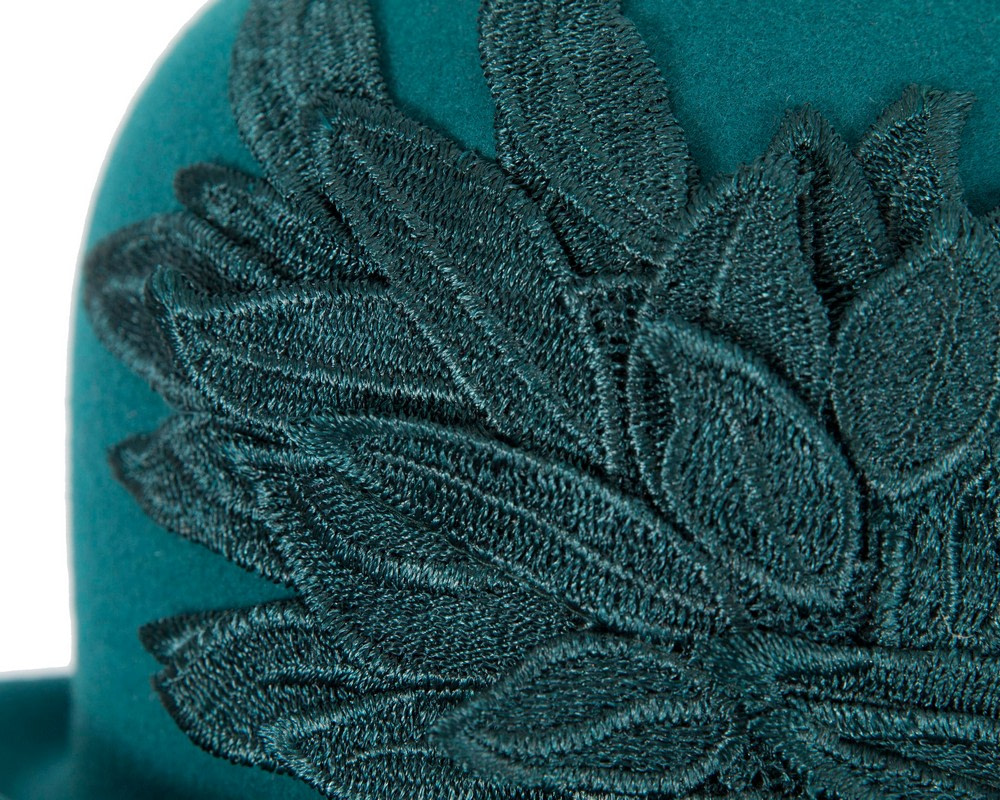 Teal green cloche made from pure wool felt and decorated with luxurious lace. This hat features unique upturned brim and will be a perfect addition to your next fashion winter outfit.