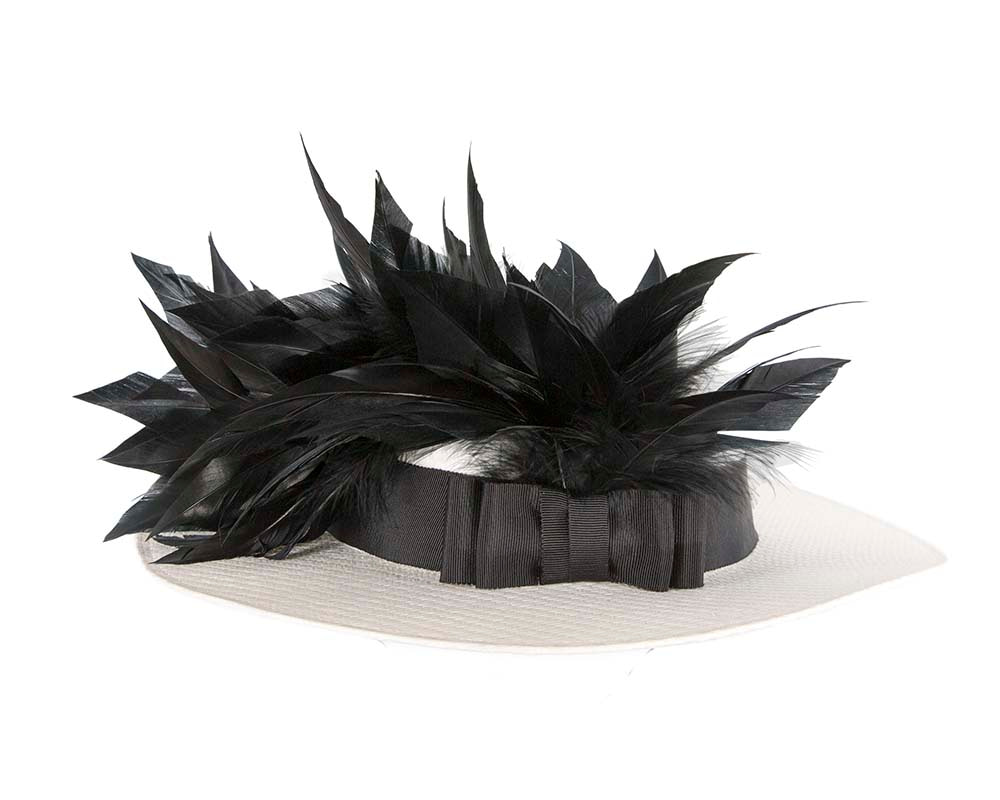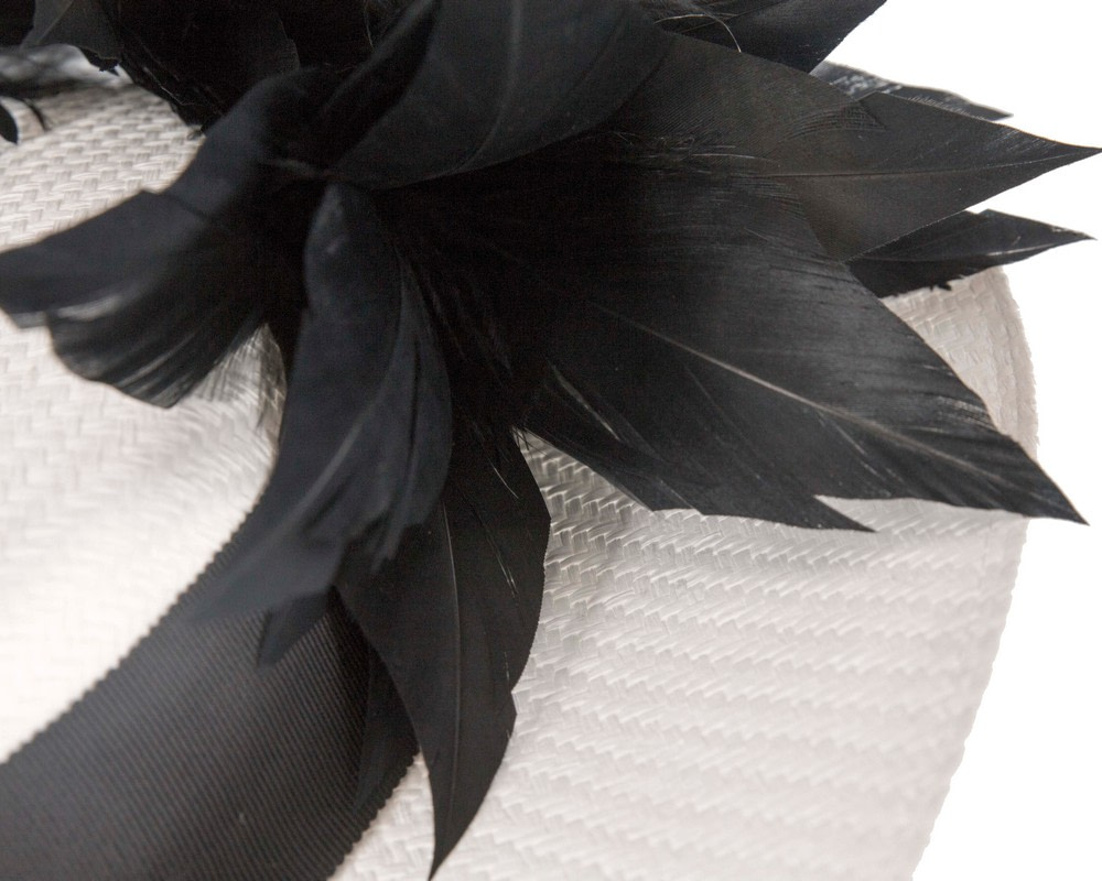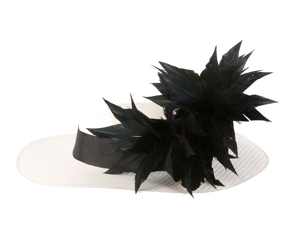Latest in fashion — white & black boater hat from latest Max Alexander collection. Trimmed with feather cocktail, this light and elegant boater hat will be a perfect accessory to wear at race day.