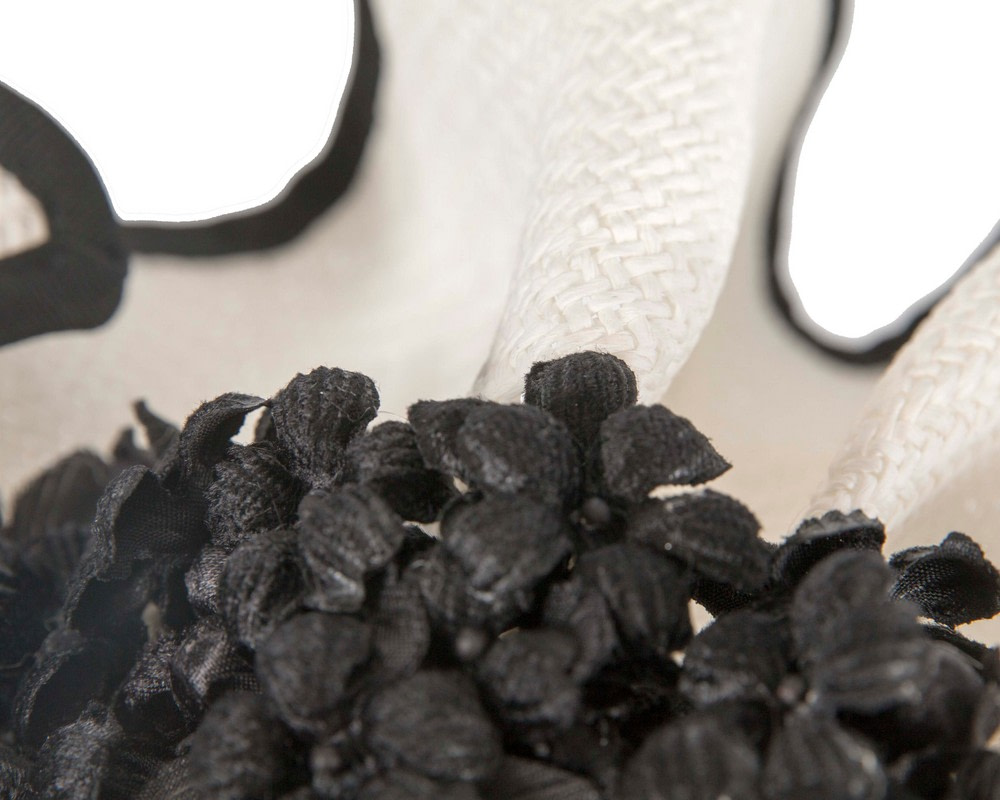 Classic white pillbox base with stylish black outline decoration and forget-me-not flower arrangement. This fascinator will be a jewel of your next spring racing outfit.