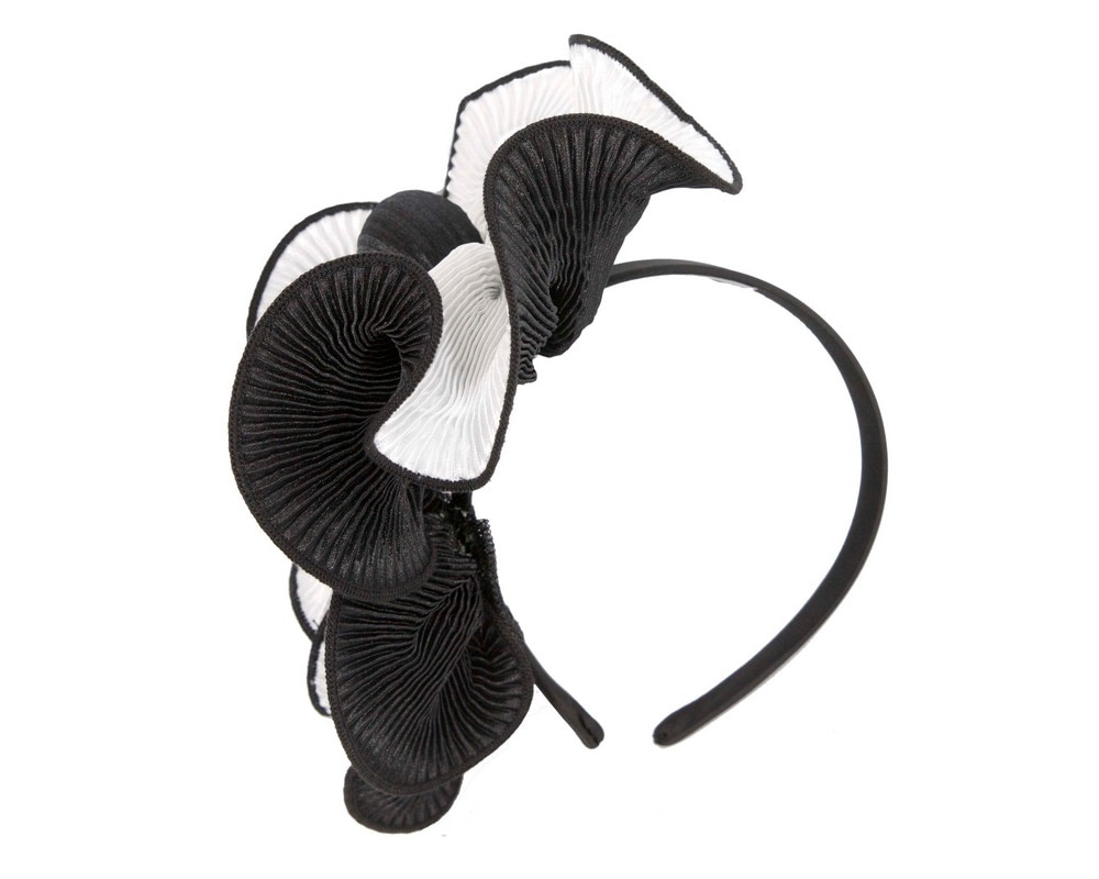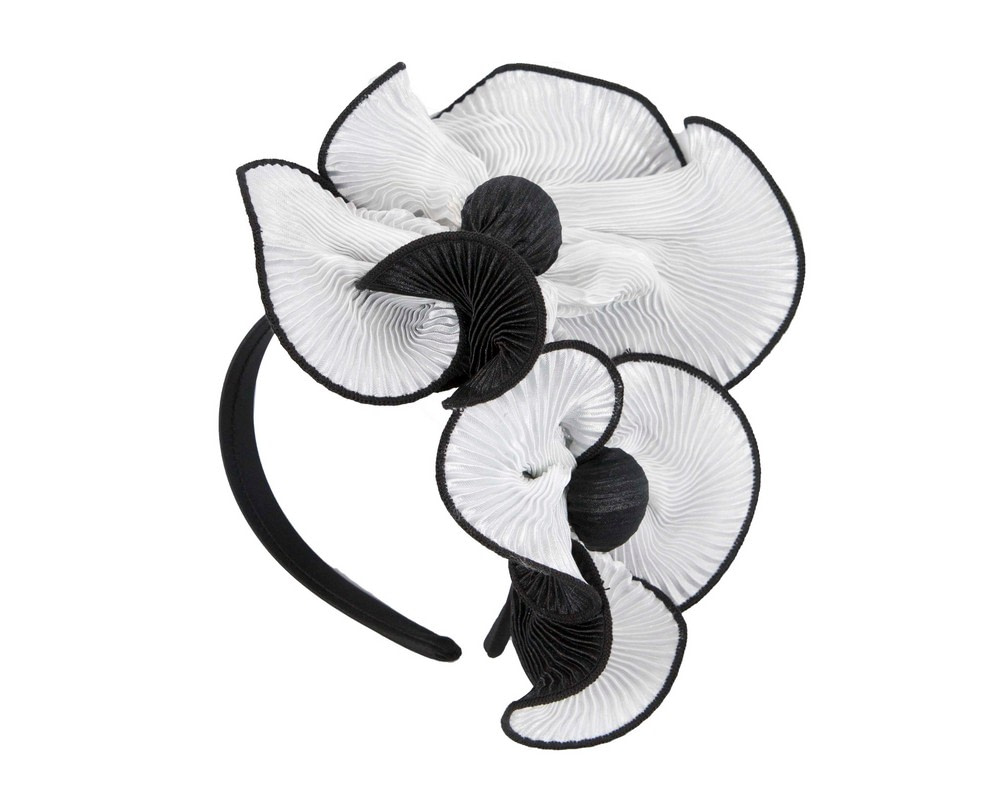 Beautiful hand-made white flowers with black backing and center. This elegant fascinator is expertly made from pleated satin and it will be a fantastic addition to your next racing outfit.