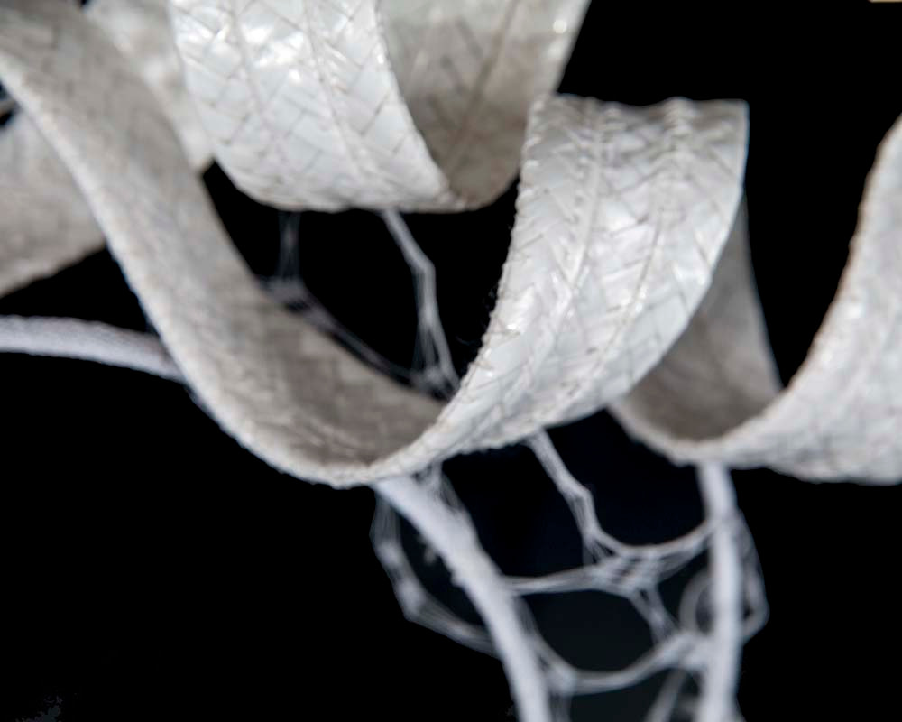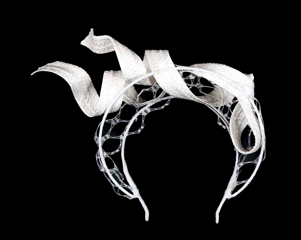 Turn heads with this striking fascinator by BELIEVERA, meticulously handcrafted in Australia. This modern and avant-garde piece features a beautifully woven white leather ribbon that twists and flows elegantly above a delicate white lace-like frame. The intricate detailing of the openwork base adds an ethereal touch, creating a perfect balance between structure and lightness.