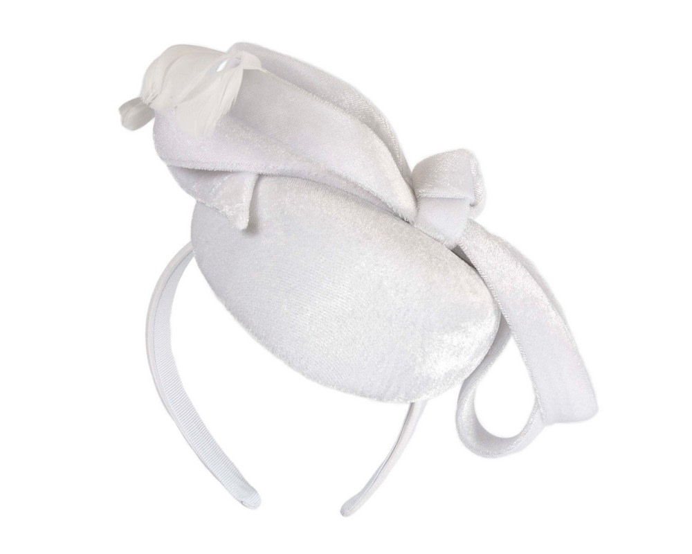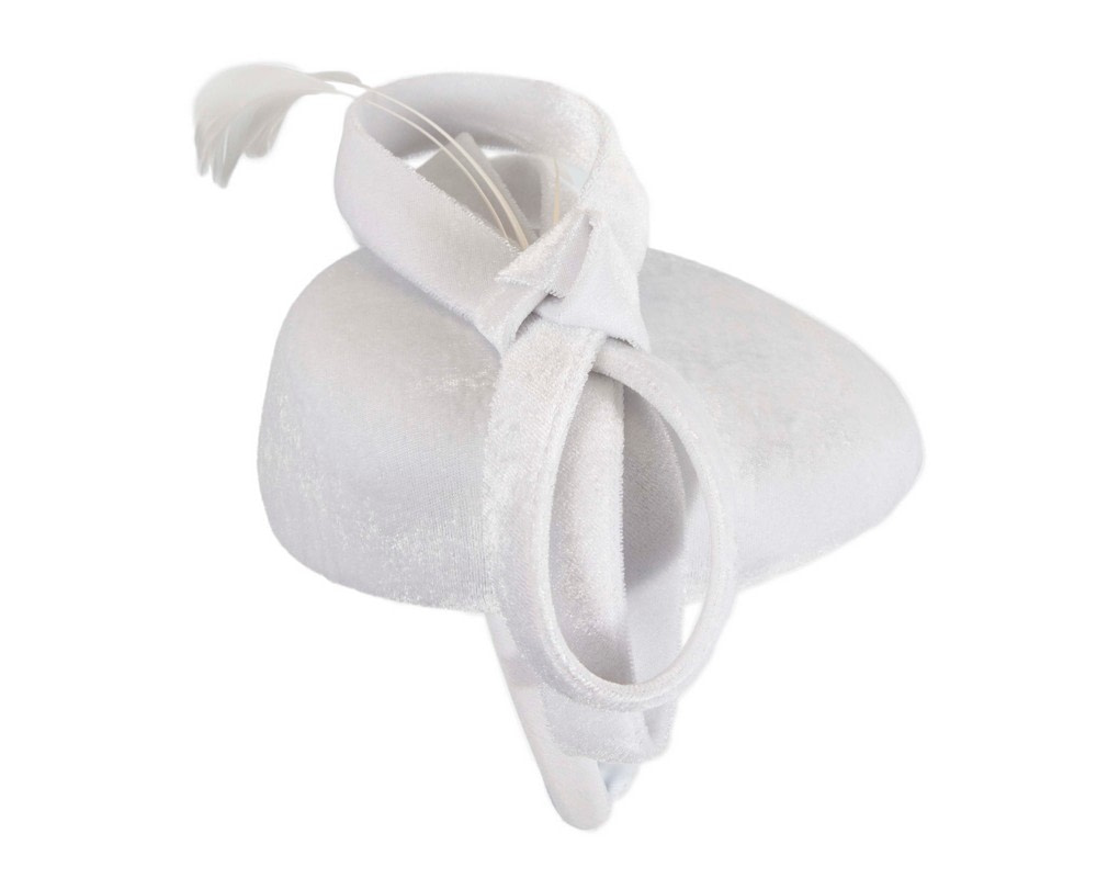 Beautiful white velvet pillbox decorated with hand-made bow and soft feathers. Perfect choice for your next autumn or winter racing outfit.