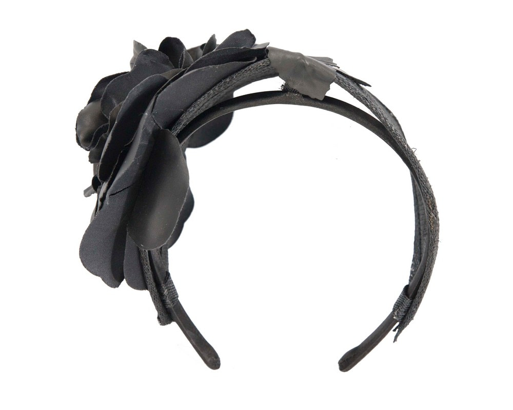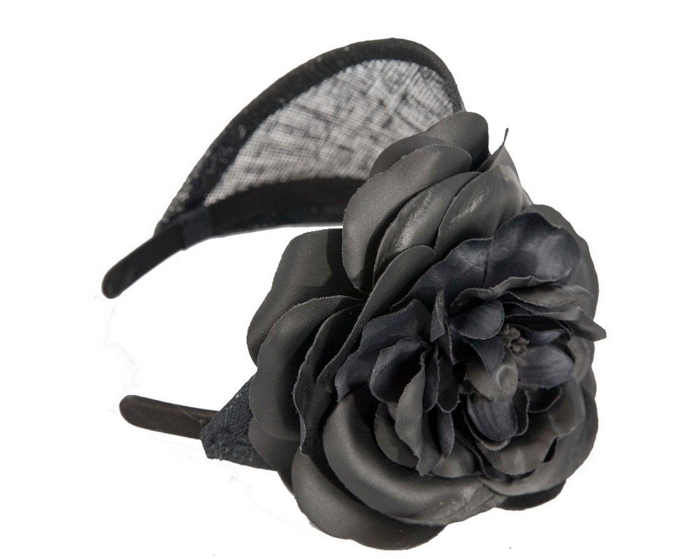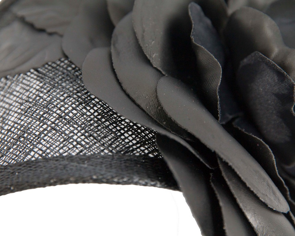 Comfortable wide black sinamay headband with elevated top, decorated with large faux leather rose. Perfect accessory for your next race meeting.
