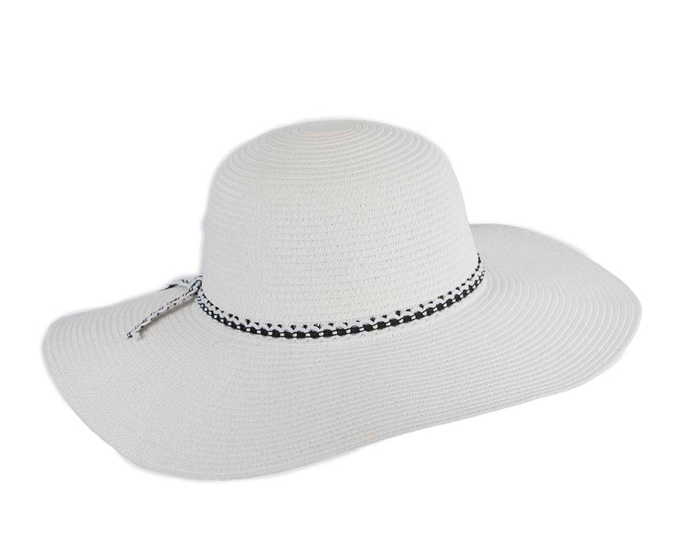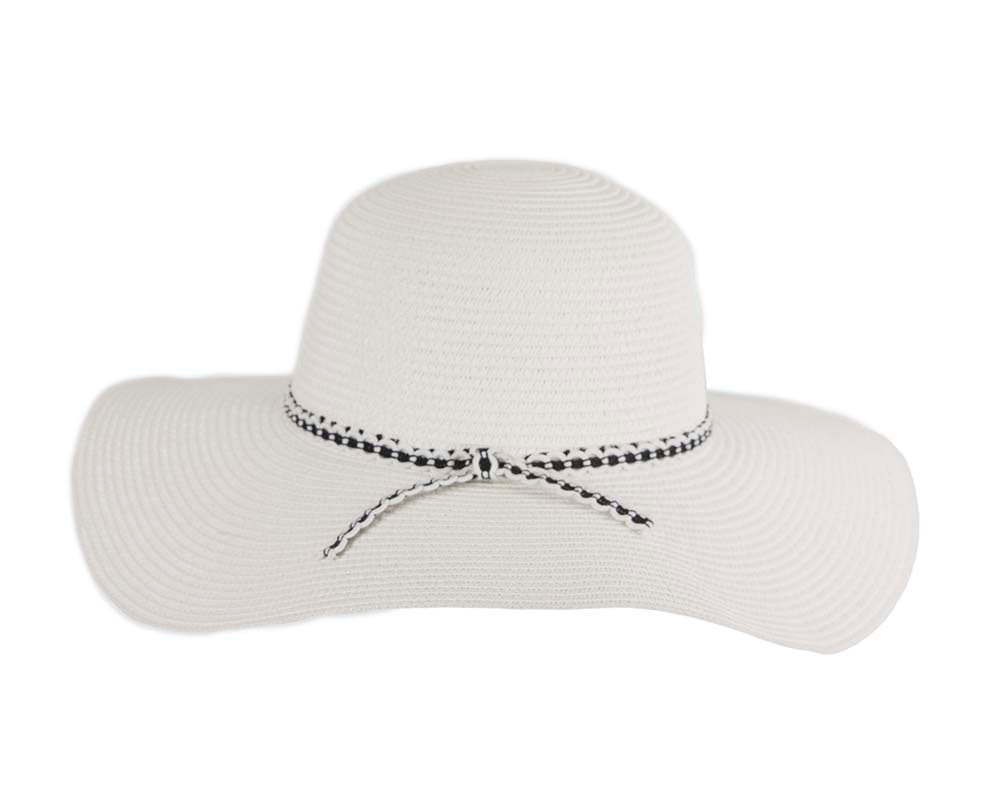 White hat with soft wide brim and elegant trim. Great summer hat for beach and casual wear.