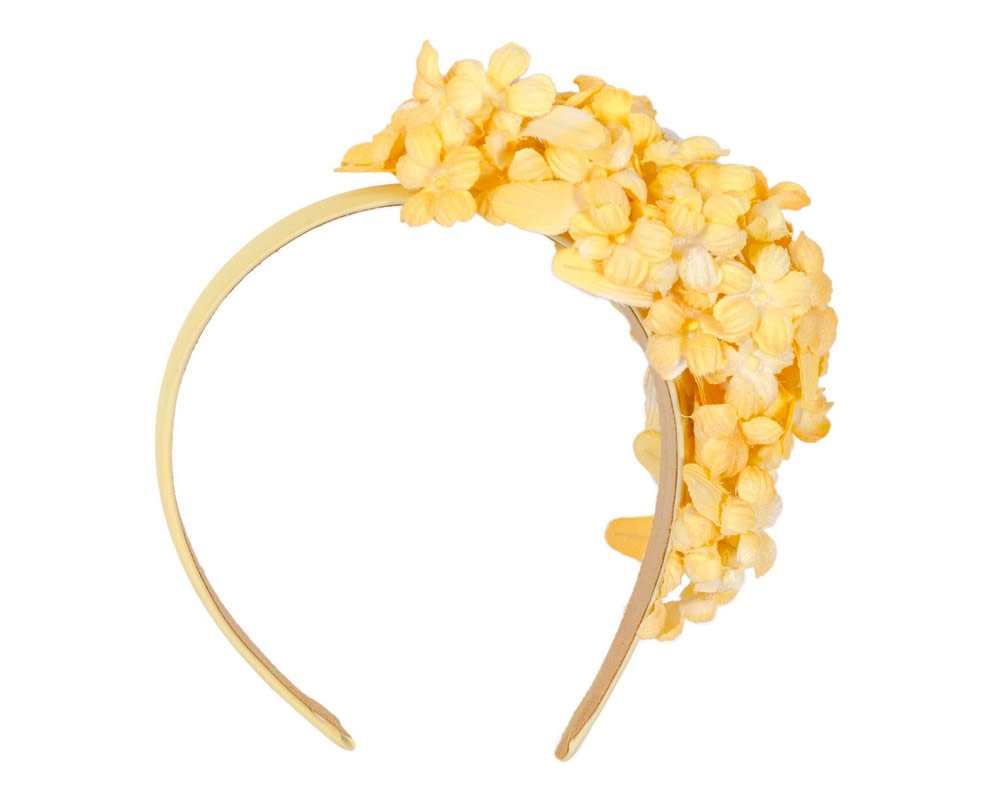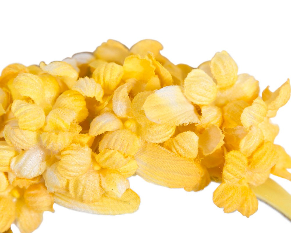 This charming yellow floral headband is a delightful accessory that adds a touch of whimsy and elegance to any ensemble. Featuring a cluster of delicate fabric forget-me-not flowers in yellow color, this headband exudes a soft, romantic appeal. Each flower is meticulously crafted, with attention to detail that highlights their natural beauty. The comfortable headband is wrapped in matching fabric, ensuring a secure and gentle fit for all-day wear. Perfect for racing carnivals, garden parties or any special occasion, this floral headband is a beautiful finishing touch to your look.